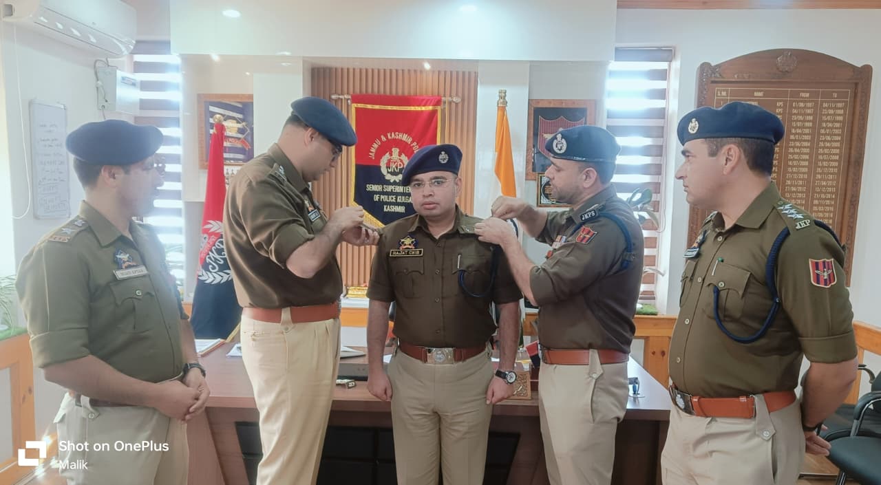 कुलगाम : हाल ही में पदोन्नत हुए दो पुलिस उपाधीक्षकों, रजत चैब-जेकेपीएस और फरहान अहमद-जेकेपीएस, जिन्होंने सफलतापूर्वक अपनी परिवीक्षा अवधि पूरी कर ली है और नई ज़िम्मेदारियाँ संभाली हैं, को सम्मानित करने के लिए डीपीओ कुलगाम में पाइपिंग समारोह आयोजित किया गया। पुलिस अधीक्षक कुलगाम अनायत अली चौधरी-आईपीएस, अपर पुलिस अधीक्षक कुलगाम, अपर पुलिस अधीक्षक एनएचडब्ल्यू काजीगुंड ने अधिकारियों को बधाई देते हुए औपचारिक रूप से उन्हें नए पद से सम्मानित किया और पुलिसिंग के प्रति उनके समर्पण, अनुशासन और प्रतिबद्धता की सराहना की।